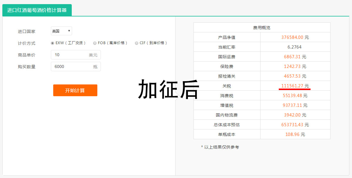 加征关税所带来的影响,最为直观的就是今后美国葡萄酒进口成本将明显增加。通过莫莫猴进口葡萄酒价格计算器可以非常明显的看到加征关税前与加征后进口成本的显著变化。